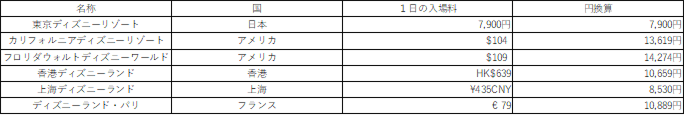 各国の通貨を円に換算すると日本の東京ディズニーランドが1番安いことが分かります。