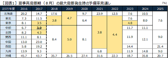 - (注)2018年度より電力融通を折り込んだ手法に変更。広域予備率が3%未満で「電力需給ひっ迫警報」を発令、5%未満で「注意報」を発令する水準。