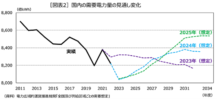 電力供給の安定は、国民生活に欠かせないのはもちろん、企業の生産活動を支える上でも大前提となります。近年は、特に電力を大量に使う半導体工場やデータセンターの新設が、各地で注目を集めています。これらの投資は、地域に産業や雇用を生み出し、地域の活性化に重要な役割を果たしています。社会のデジタル化が進む中で、これまで減少傾向にあった電力需要が増加に転じ、今後は更に伸びていくと見られます。実際、電力広域的運営推進機関による国内の需要電力量の見通しは、2023年の想定では人口減少や省エネルギーの進展などの影響が大きく、国内で必要とされる電力量は減少していくものでしたが、2024年以降の想定ではデータセンターや半導体工場の増加などにより、増加していくとの見方に変わっています[図表2]。仮に、電力の価格や供給が安定しなければ、企業は新たな投資に踏み切れず、地域経済にも悪い影響を及ぼしかねません。