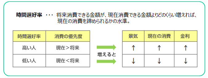 ここで時間選好率という言葉を紹介します。これは、将来消費できる金額が現在消費できる金額よりどのくらい増えれば、将来の消費のために、現在の消費を諦められるかを表します。現在の消費と将来の消費の優先度を表しているとも解釈できます。時間選好率は、人それぞれ異なり、現在の消費を優先する人ほど時間選好率は高くなります。金利は現在お金を貸した場合に、将来受取る金額がどれくらい増えるかを表すので、時間選好率と金利はとても似ています。