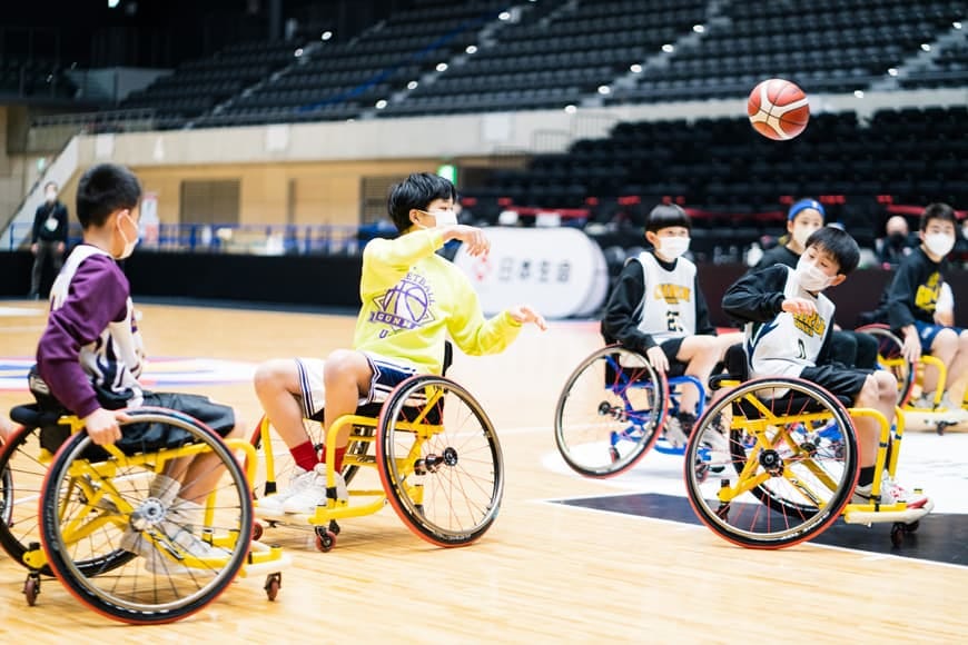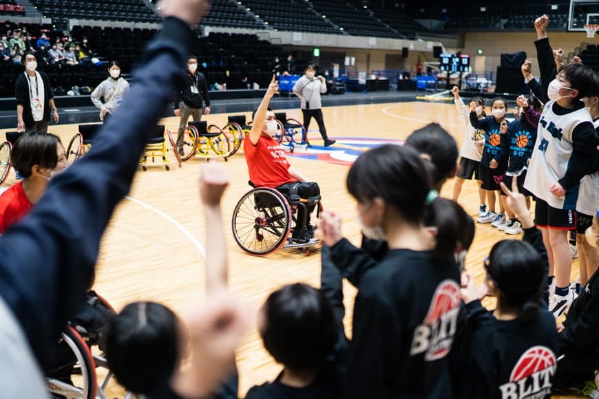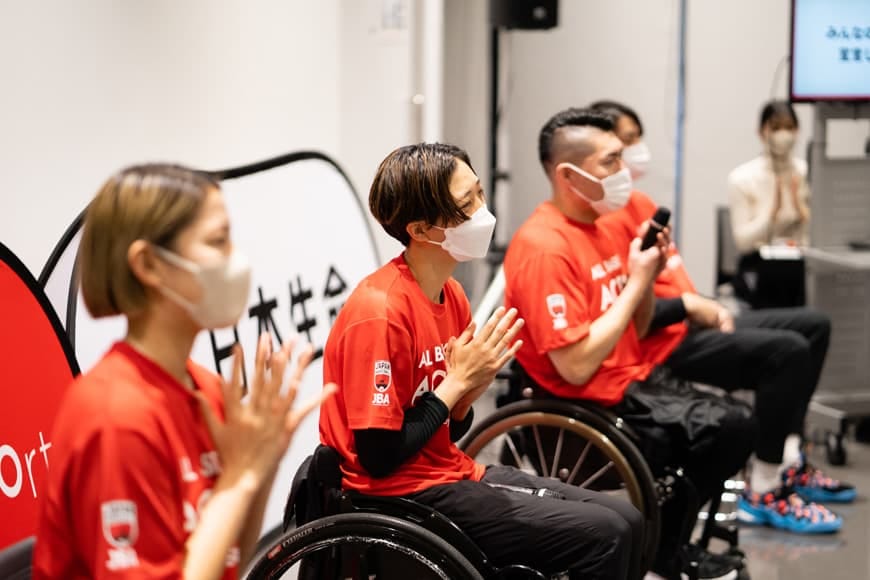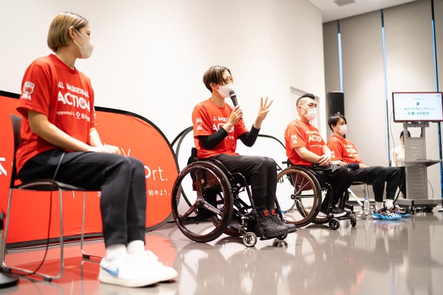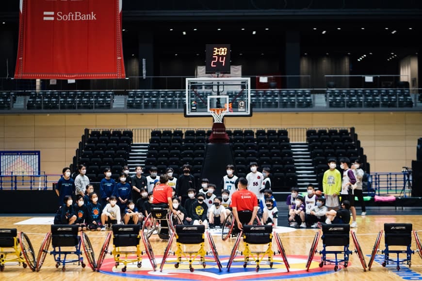 東京2020パラリンピック男子車いすバスケットボールの銀メダリストの藤澤潔選手、女子代表の北田千尋選手、 3人制バスケットボールで活躍する桂葵選手、元男子バスケットボール日本代表の渡邉拓馬氏をお呼びし、高崎市内のミニバスチームの選手40人が講演や車いすバスケットボールの体験を通じて、夢を持つことの大切さを学びました。
