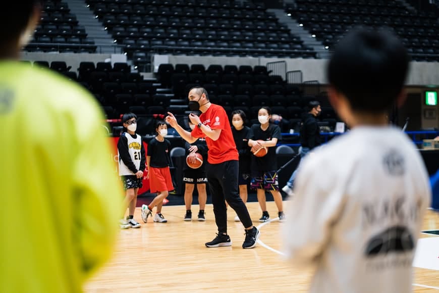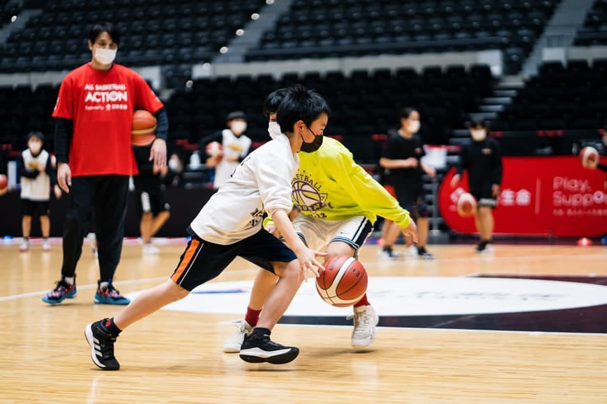 日本バスケットボール協会でスポーツパフォーマンスコーチを務める佐藤晃一コーチ指導のもと、桂葵選手、渡邉拓馬氏とともにバスケットボール教室を実施しました。
