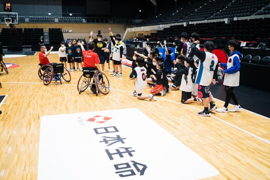 車いすバスケットボールの体験会も開かれ、子どもたちが実際に車いすに乗ってプレーをしました。子どもたちは、競技用車いすに乗るのは初めてでしたが、そのスピード感に感動。「経験できて楽しかった」、「選手の動きがとても速かった」と笑顔で語っていました。