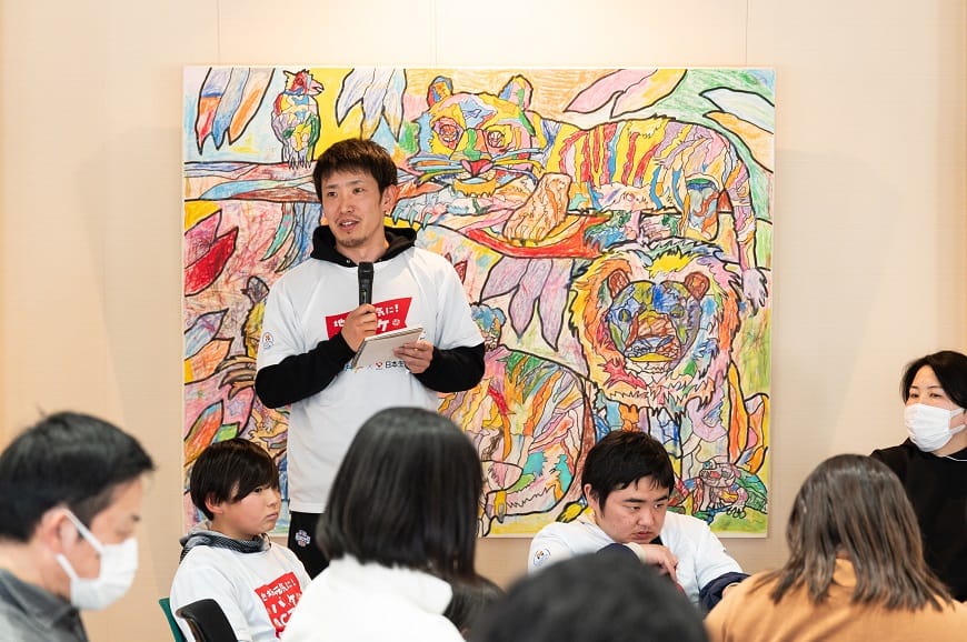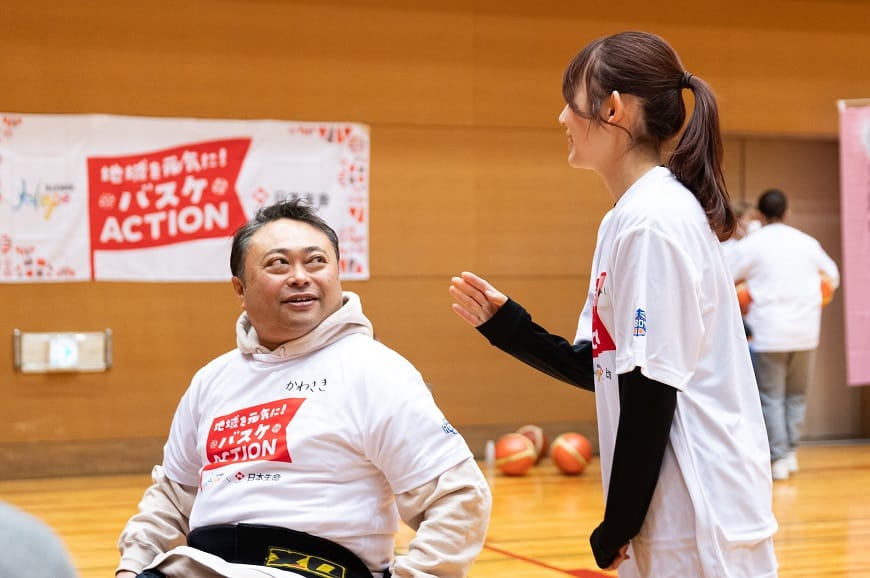 2月23日(日)のイベントには、茨城ロボッツのモサク ダミロラ選手が車いすバスケットボール体験会に、平尾充庸選手が三代氏の講演に参加いただきました。