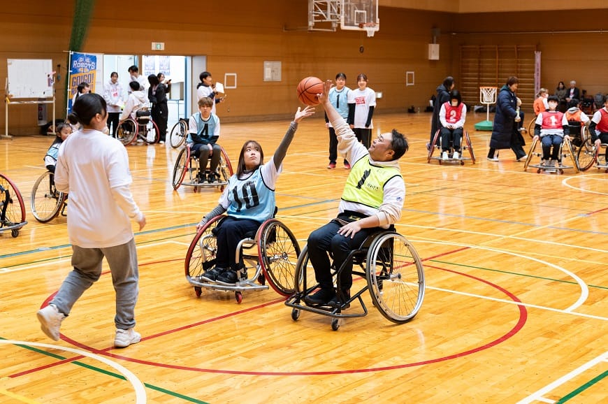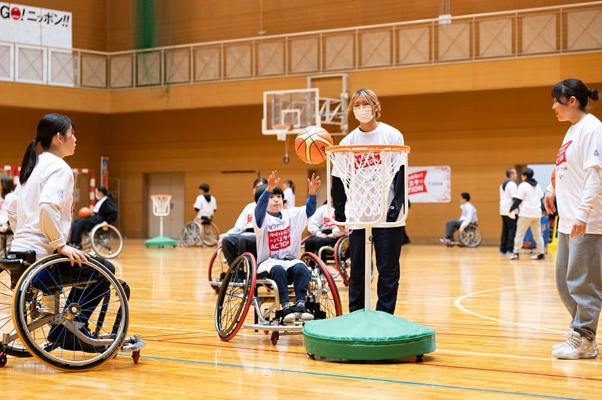 「B.LEAGUE Hope×日本生命 地域を元気に!バスケACTION」の一環として、「多様性と人権の尊重」・「地域のにぎわい創出」を目的に、茨城ロボッツと連携協定を結んでいる地元大学『茨城県立医療大学』の車いすバスケットボールチームやいばふく(茨城から福祉で世界を元気にするプロジェクト)をはじめとする地域の皆さまの協力のもと、2/8(土)、2/23(日)の2日間で、茨城県在住の方を対象に、車いす体験イベントを開催しました。