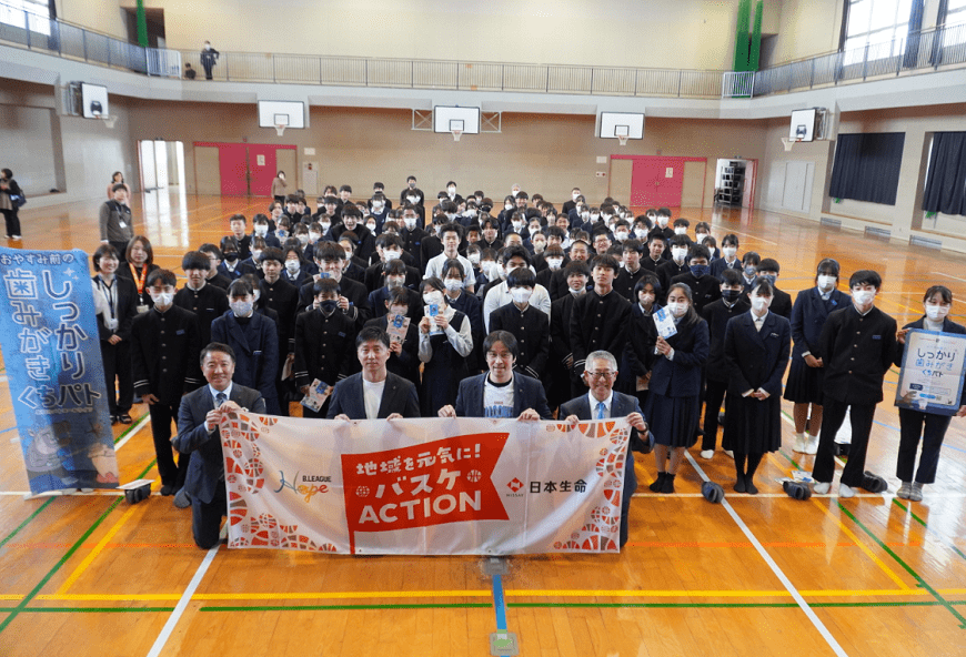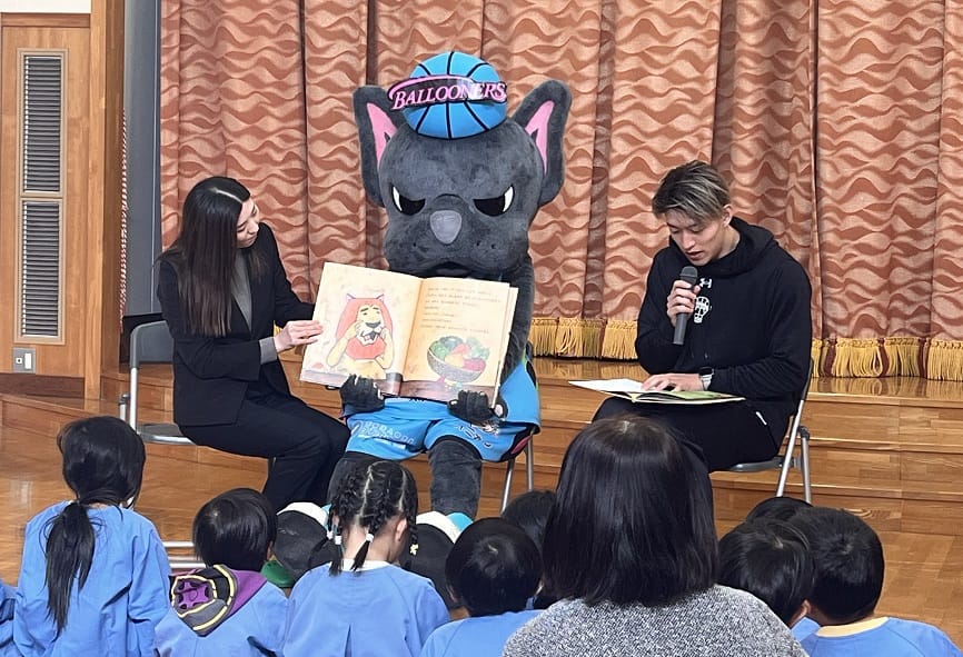 佐賀バルーナーズと日本生命佐賀支社は、ビジネス交流会のほか、2月18日(火)に選手による園児向けの絵本読み聞かせや、2月26日(水)にはクラブコーチが中学校で「夢をかたる」授業を実施しました。