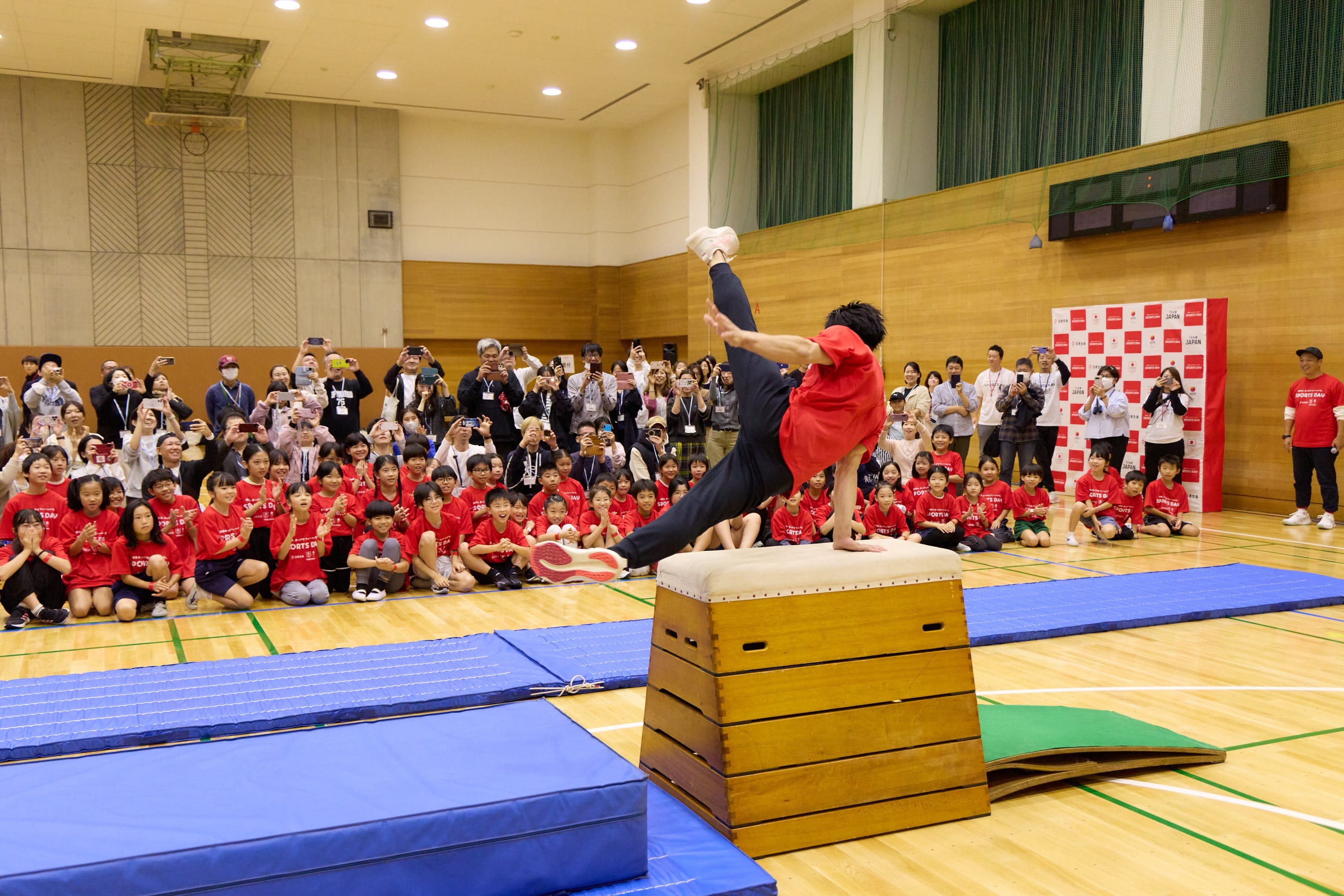 跳び箱を使ってのあん馬・マットでのバク転を間近で見た子どもたちからは、大きな歓声があがりました。