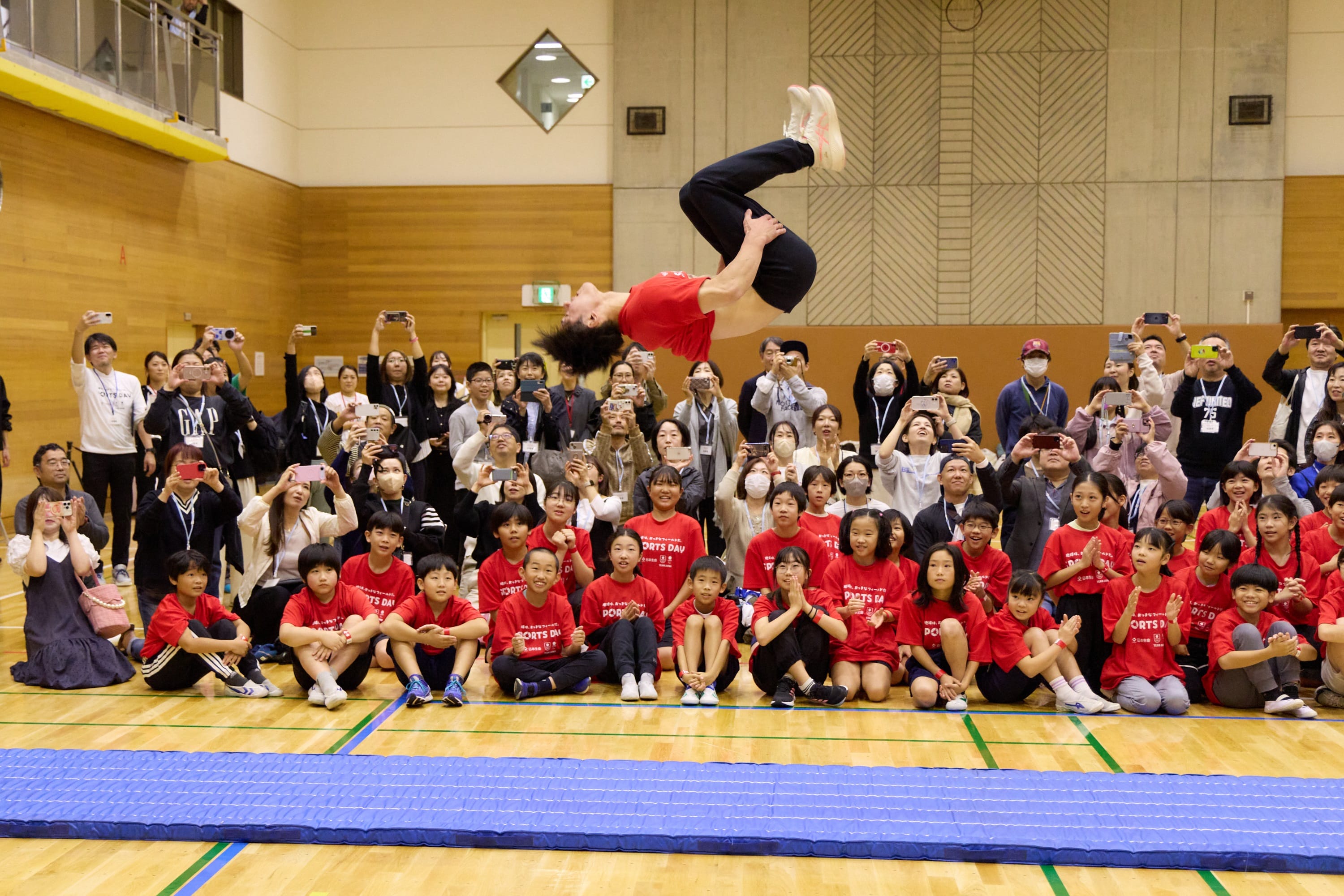 第1部の体操教室では、準備運動のあと、橋本選手が講師となって、マット運動・跳び箱運動にチャレンジしました。