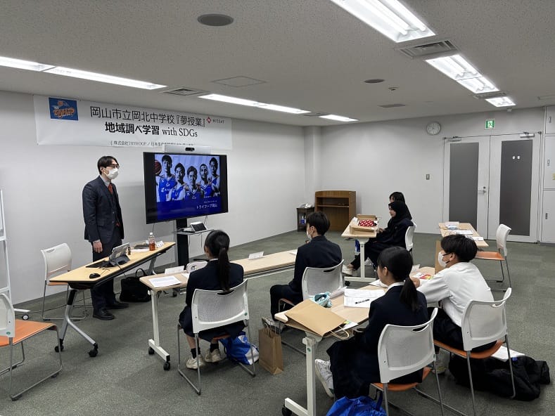 この夢授業は、将来について考えるきっかけづくりを目的に企画されています。当日は、トライフープ岡山取締役の中島聡様(元社長・元選手)が講師を務め、選手・経営者の両面から、スポーツクラブ運営について語っていただき、普段は聞けないクラブの裏側の話に、参加した生徒たちは熱心に耳を傾けていました。