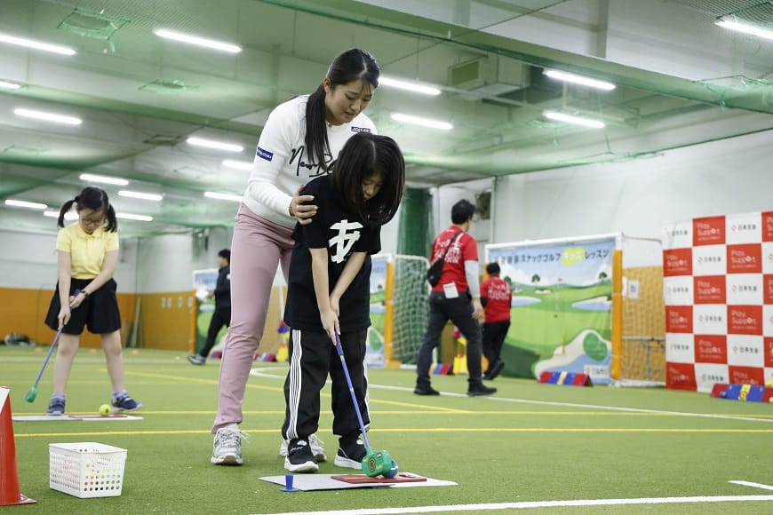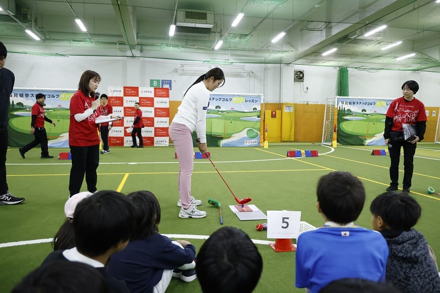 子どもたちに日本を代表する選手と接することで「夢・感動」を感じてもらうことやスポーツを通じて、多種多様な経験・人との交流を通じた成長機会を提供し、子どもたちが自分らしく心身共に健全に成長していくことを目的に、小学生向けのスナッグゴルフレッスンを初開催しました。