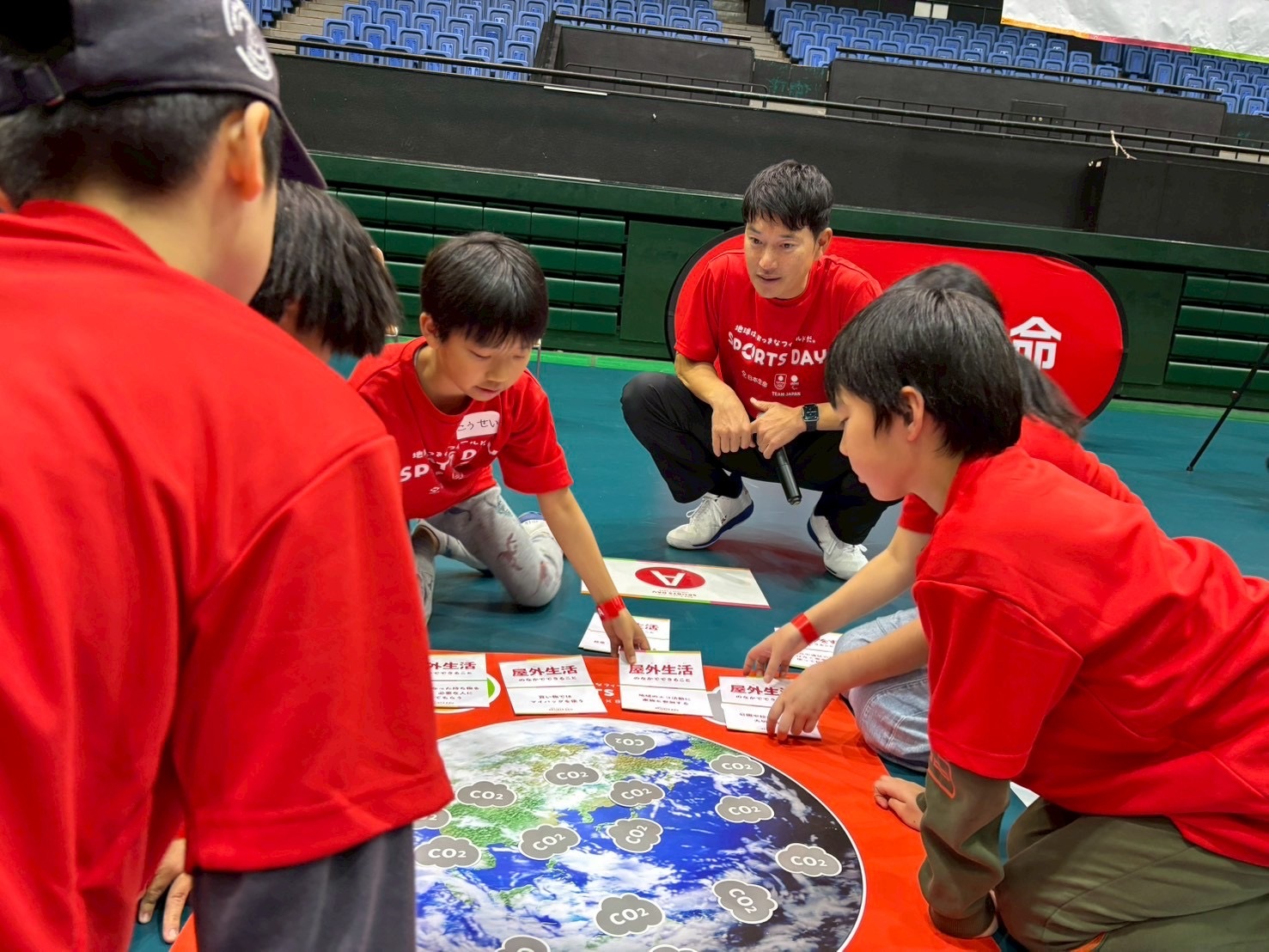 その後、小田選手・近藤プロも参加して地球温暖化をテーマにしたカードゲームをグループに分かれて実施しました。