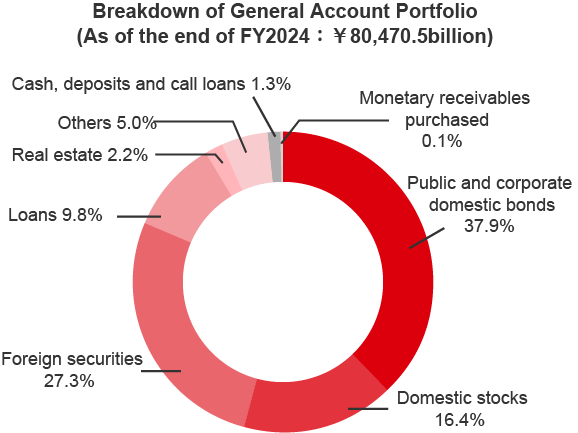 Specifically, we use an ALM* approach to generate the stable returns promised to our policyholders and primarily invest in Japanese government bonds and other yen-denominated fixed-income instruments while also investing in higher-risk assets, like foreign securities, under the prerequisites of stringent risk management and sound management principles. We are also working to improve our ability to obtain stable returns by building a balanced and diversified portfolio that includes investments in different assets, countries, currencies and other factors, as well as by carefully managing transactions in line with the cyclical movement of markets over the mid- and long- term.
