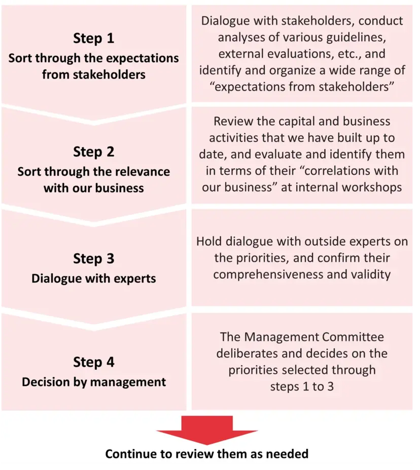 (1)Sort through expectations from stakeholders through dialogues and analyses of various guidelines, external evaluations, and so forth, (2) evaluate and identify their relevance to our business in internal workshops, (3) engage in dialogues with outside experts, then (4) determine materiality as management. We will continue to revise the priorities as necessary based on trends in society and impacts on management.