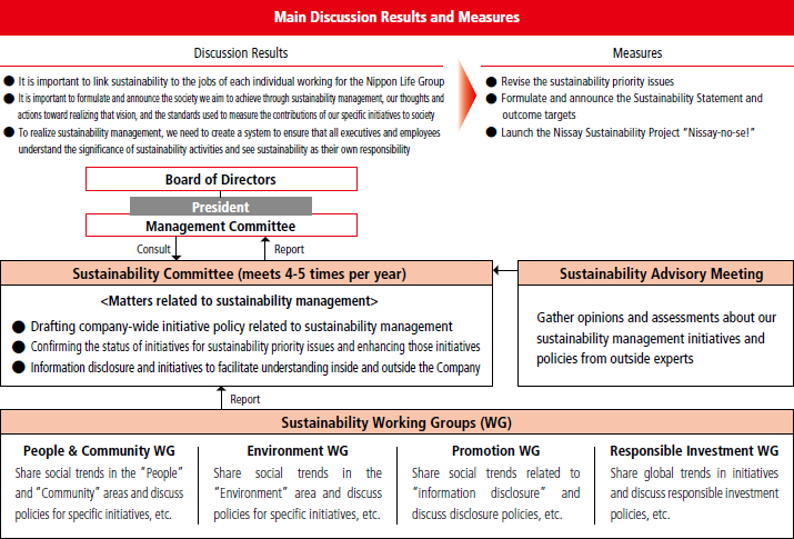 We have established the Sustainability Committee as an advisory body to the Management Committee. The Committee discusses matters such as the drafting of company-wide initiative policy (including Group companies), the status and enhancement of initiatives for sustainability priority issues, and information disclosure and initiatives to facilitate understanding inside and outside the Company. With the Sustainability Management Department and Responsible Investment and Lending Promotion Office as its secretariat, the Committee meets four to five times a year, with core members consisting of the Executive Officer Responsible for Planning, executive officers responsible for each business unit, and executives from each domestic Group company responsible for sustainability (committee members since this fiscal year). In addition, the Sustainability Working Groups led by department managers provide forums for a wide range of discussions to further promote sustainability management.