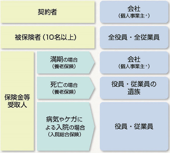 - *個人事業主の方が当制度を利用される場合は、養老保険の保険料の1/2と入院総合保険(有期)の保険料の全額を「必要経費」としてください。ただし、個人事業主本人および家族従業員を被保険者とする契約の保険料については、事業上のものとみなされませんので、必要経費とすることができません。