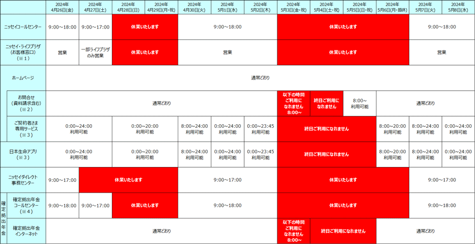 なお、4月26日(金)~5月6日(月)のお問合せ(資料請求・保険相談含む)については、5月7日(火)以降の対応となる場合がございますので、あらかじめご了承ください。 - ※3詳細につきましてはこちらをご覧ください。