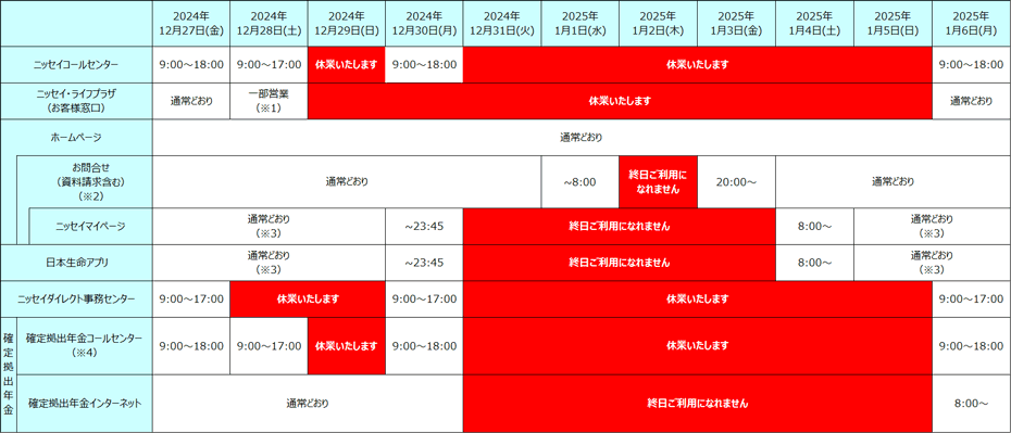 なお、12月26日(木)~1月5日(日)のお問合せ(資料請求・保険相談含む)については、1月6日(月)以降のご対応となる場合がございますのであらかじめご了承ください。 - ※3詳細につきましてはこちらをご覧ください。