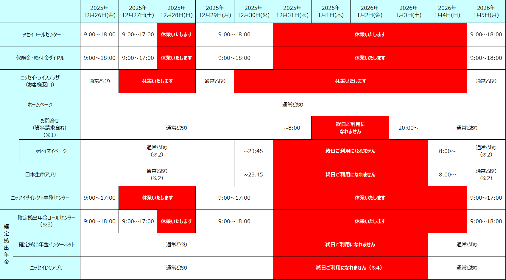 - ※1ホームページ照会(資料請求含む)については、翌営業日以降のご対応とさせていただいております。また、お問合せ・ご相談内容によっては日数がかかる場合もございます。なお、12月25日(木)~1月4日(日)のお問合せ(資料請求・保険相談含む)については、1月5日(月)以降のご対応となる場合がございますのであらかじめご了承ください。