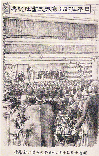 厳格な診査と馬車馬主義は、保険事業の基礎となる健全な被保険者集団をいち早く形成することにつながりました。1892(明治25)年、当社は保有契約高500万円を達成し、祝賀会と開業式を兼ねた祝典を開催しました。開業して3年、経営が軌道に乗るのを待って開業祝典を挙行したことは、当社の堅実性の表れとして人々に感銘を与えたといいます。