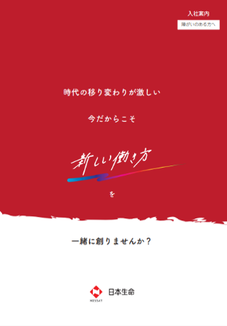 日本生命はさまざまな能力をもった幅広い人材を必要としており、障がいのある方にもいかんなく能力を発揮できるフィールドを用意しております。意欲高い方の応募をお待ちしております。