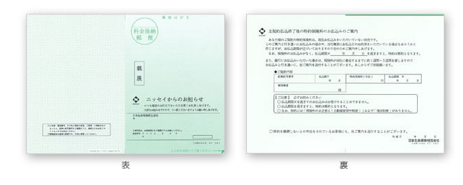主契約の保険料払込が終了しているご契約で、特約保険料の払込みがお済みでない契約について、特約保険料払込をご案内をする通知。