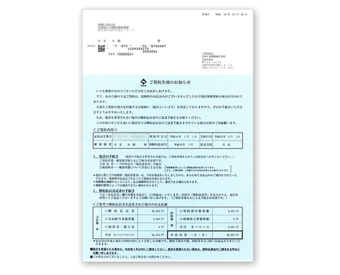 払込猶予期間内に保険料のお払込みがなかったため、保険契約の効力が失われた(失効)ご契約のご契約者へ、その旨のご連絡と失効時の解約払戻金などをお知らせする通知。