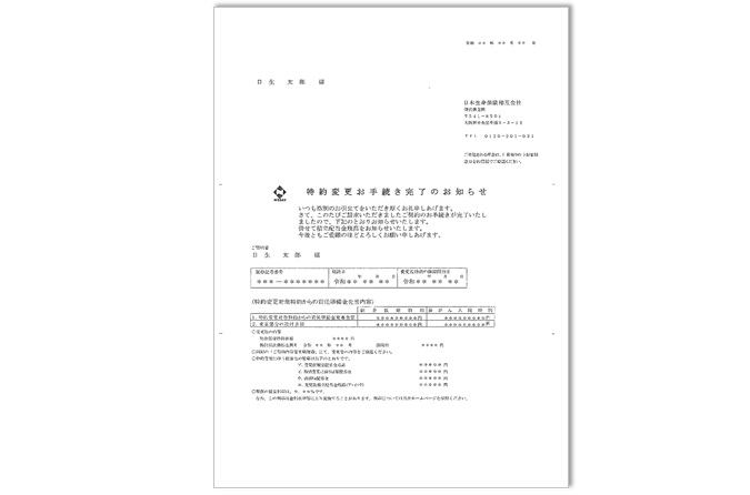 特約変更のお申出をいただいているご契約に対し、そのお手続きが完了したことをお知らせする通知。