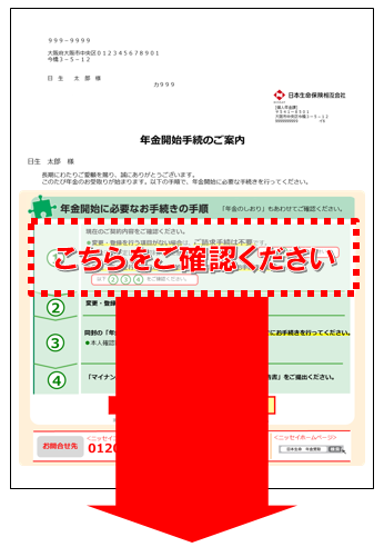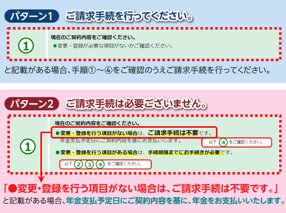 お客様のもとに「年金開始手続のご案内」が届きましたら、表紙に記載されている“手順①”が、以下どちらのパターンに該当するかご確認ください。