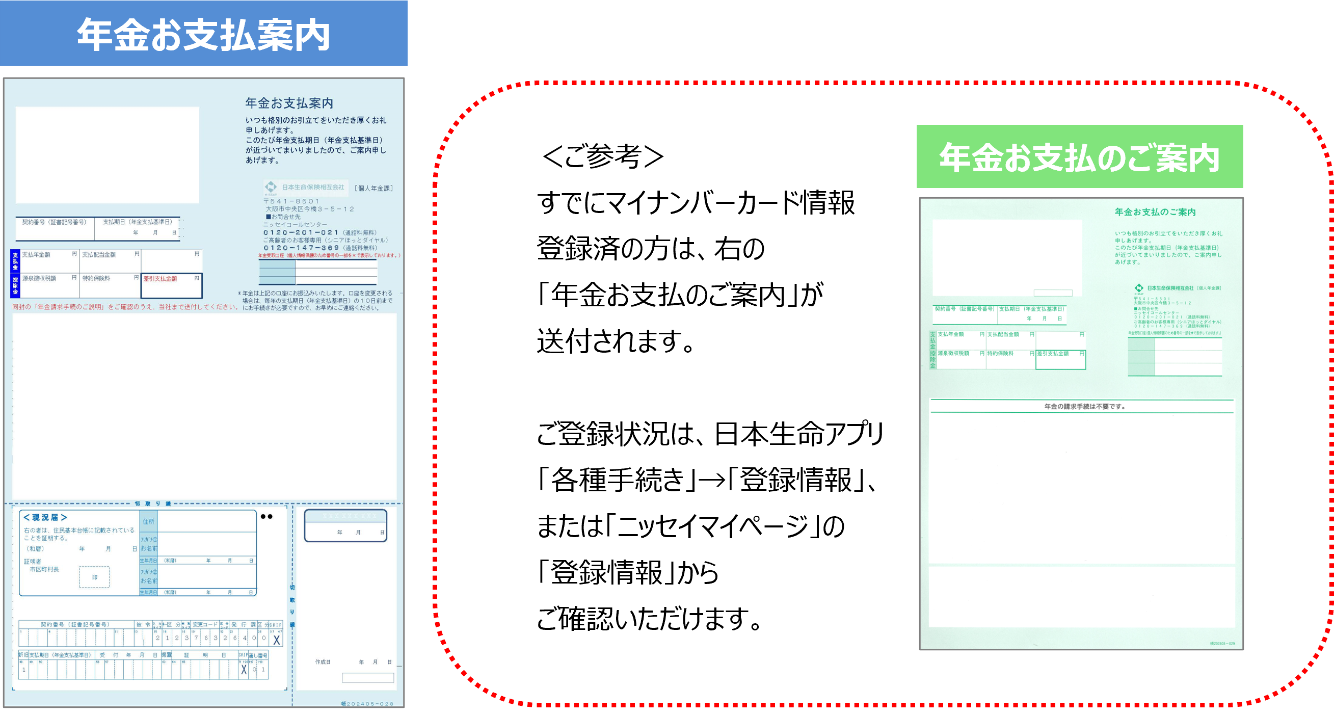 2025年4月以降にご案内する契約において、日本生命アプリにてマイナンバーカード情報をご登録いただくことで、最長5年間ご生存の確認ができる書類(現況届等)の提出不要で年金をお受取りいただけます。