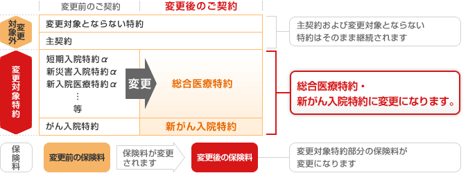 平成20年10月1日以前のご契約に付加されている入院・手術などに備える特約を総合医療特約・新がん入院特約に変更することができます。特約変更の際に、告知・診査は不要です。