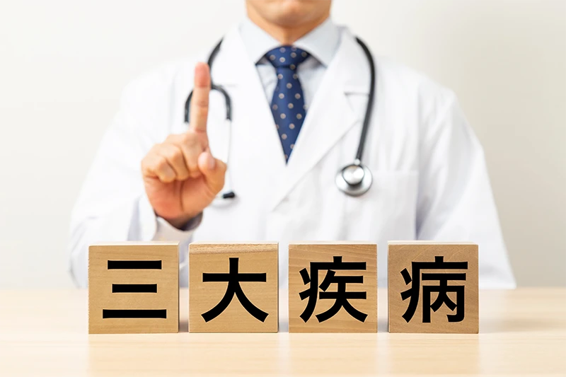 三大疾病とは、「がん」「心疾患」「脳血管疾患」の3つの病気をまとめた総称です。三大疾病は日本人の死因の上位を占めており、治療も長期化する傾向があります。