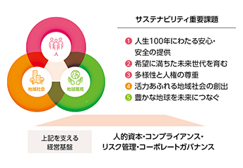 日本生命グループは、重点的に取り組む領域として「人」「地域社会」「地球環境」の3領域を定め、サステナビリティ重要課題5項目に対する取り組みを進めています。また、これらを支える経営基盤として、人的資本、コンプライアンス、リスク管理、コーポレートガバナンスもサステナビリティ重要課題としています。