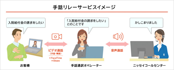 また、お電話での会話が困難なお客様(聞こえにくい等)に対するサービスとして、お客様がパソコンやスマートフォンのビデオ通話システムから、手話通訳オペレーターによる同時通訳を介して、手話や筆談で当社コールセンターにお問合せいただける「日本生命手話通訳リレーサービス」の提供等を行っております。