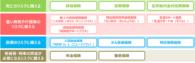 「みらいのカタチ」は、ご加入時・ご加入後を問わず、多彩な保険の組み合わせを可能とすることで、 お客様の一生涯をサポートし続ける商品です。ご加入時においては、「死亡のリスク」「重い病気や介護等のリスク」「医療のリスク」「老後等、将来の資金が必要になるリスク」に備えられる12種類の保険を自在に組み合わせることができ、お客様にぴったりの保障を提供します。