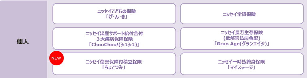 さらに、お客様の多様なニーズにお応えすべく、 2025年1月から「ニッセイ傷害保障付積立保険"ちょこつみ"」、2025年6月から法人のお客様向けに、「ニッセイ傷害死亡重点期間設定型介護保障保険“フェニックスケアプラス”」を新たに発売しました。「みらいのカタチ」以外の商品、銀行等提携金融機関取扱商品についても、商品の拡充を図っています。