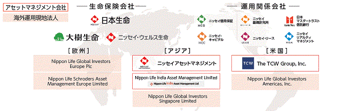 日本生命グループでは、海外の運用拠点を含むグローバルな運用体制を構築しており、グループの専門人材の結集等を通じ、運用体制の強化を図るとともに、各社の強みを生かしながら、資産運用の収益源の多様化・資産の分散化を推進しています。