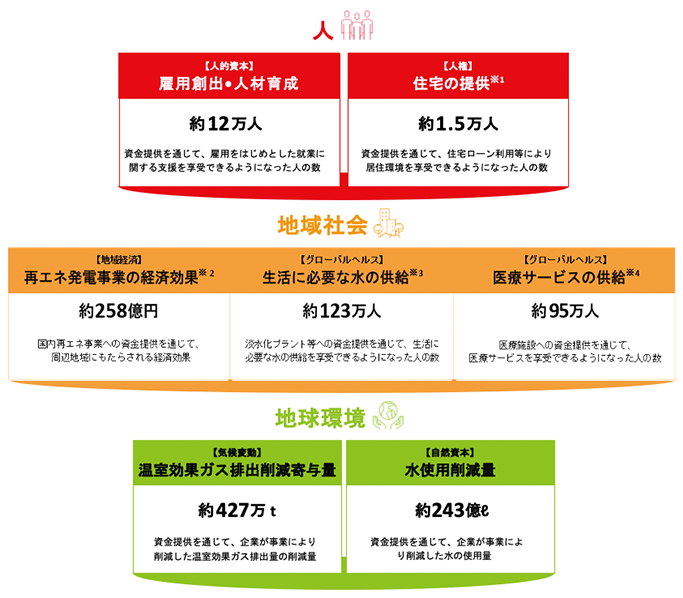 アウトカムとは、実社会に対するポジティブなインパクトの創出、あるいはネガティブなインパクトの削減を示す成果や効果を指し、サステナビリティ・アウトカムとも呼ばれます。当社が創出したアウトカムは、投融資先企業が提供している情報をもとに、投融資額の持ち分を考慮した上で算出しています。