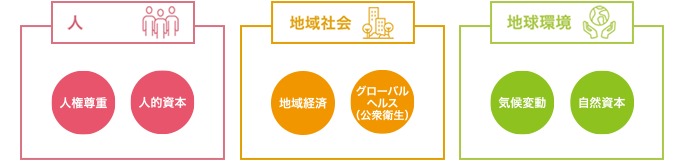 当社は、「気候変動」「自然資本」「地域経済」「グローバルヘルス」「人権尊重」「人的資本」の6つを資産運用のサステナビリティ重点取組テーマとして特定しています。なお、外部環境や社会を取り巻く状況等の変化をふまえ、定期的にサステナビリティ重点取組テーマの見直しを実施します。