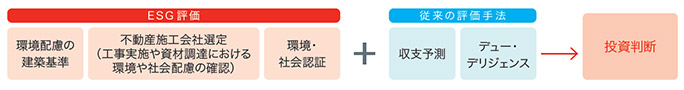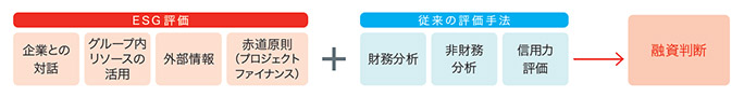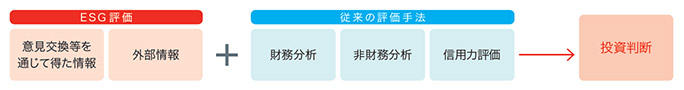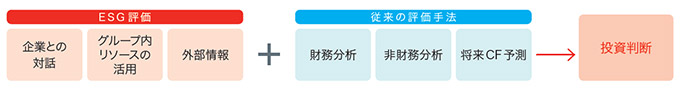 具体的には、資産特性に応じた方法で投融資先のESG取り組みを評価したうえで、財務分析などの従来の分析に、企業価値や信用力への影響などの観点でESG評価を加味し、投融資判断を行っています。