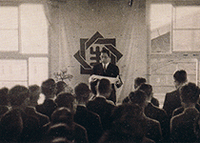 記念式典で挨拶する常務の弘世現(当時)