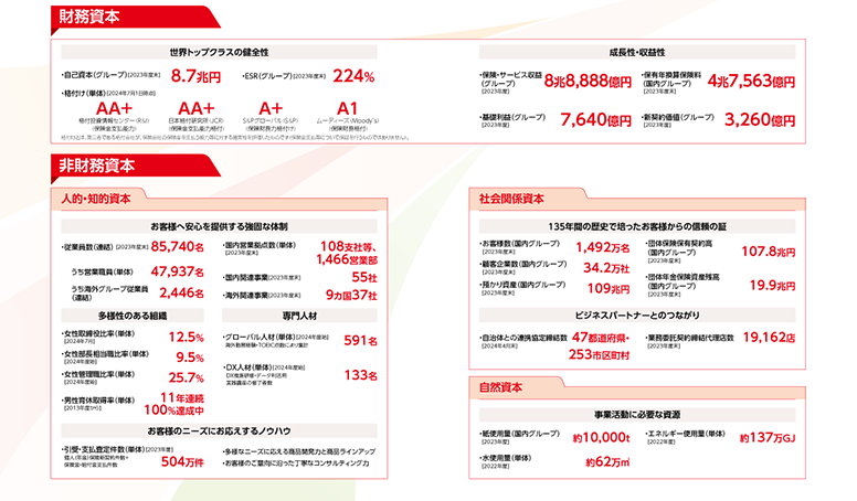 当社グループは創業来、生命保険をはじめさまざまな事業を通じて価値創造の源泉となる資本を蓄積してきました。とりわけ人的資本の強化を原動力として、健全性の確保や収益力の向上等による財務資本の強化と、事業活動を支える多様な非財務資本の強化を通じ、持続的な企業価値向上を生み出す好循環を実現します。
