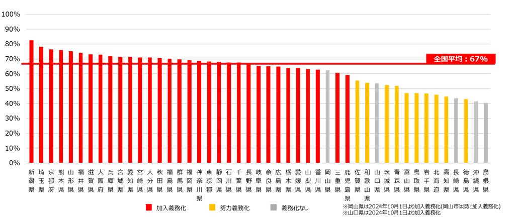 自転車保険加入者の割合についても、加入義務化されている都道府県は高く、努力義務化もしくは義務化されていない都道府県では低いという結果となりました。