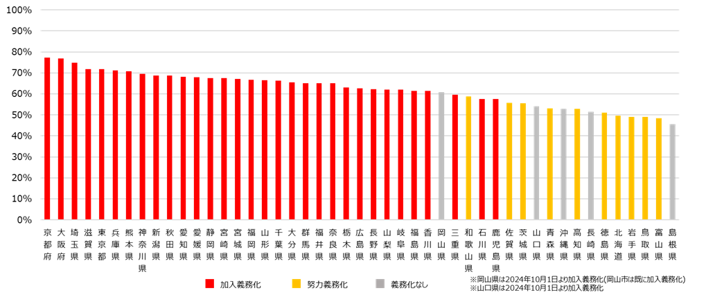 また、義務化の状況を「知っている」と回答した方の割合は、加入義務化されている都道府県は高く、努力義務化もしくは義務化されていない都道府県では低いということが分かりました。